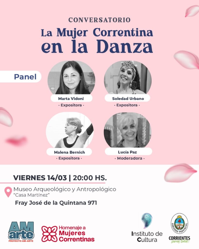 En tanto, el viernes 14, a las 20, se concretará el conversatorio “La mujer correntina en la danza”. El encuentro se desarrollará en el Museo Arqueológico y Antropológico (Quintana 971) con la exposición de Marta Vidoni, Soledad Urbano y Malena Bernich, y Lucía Paz como moderadora.