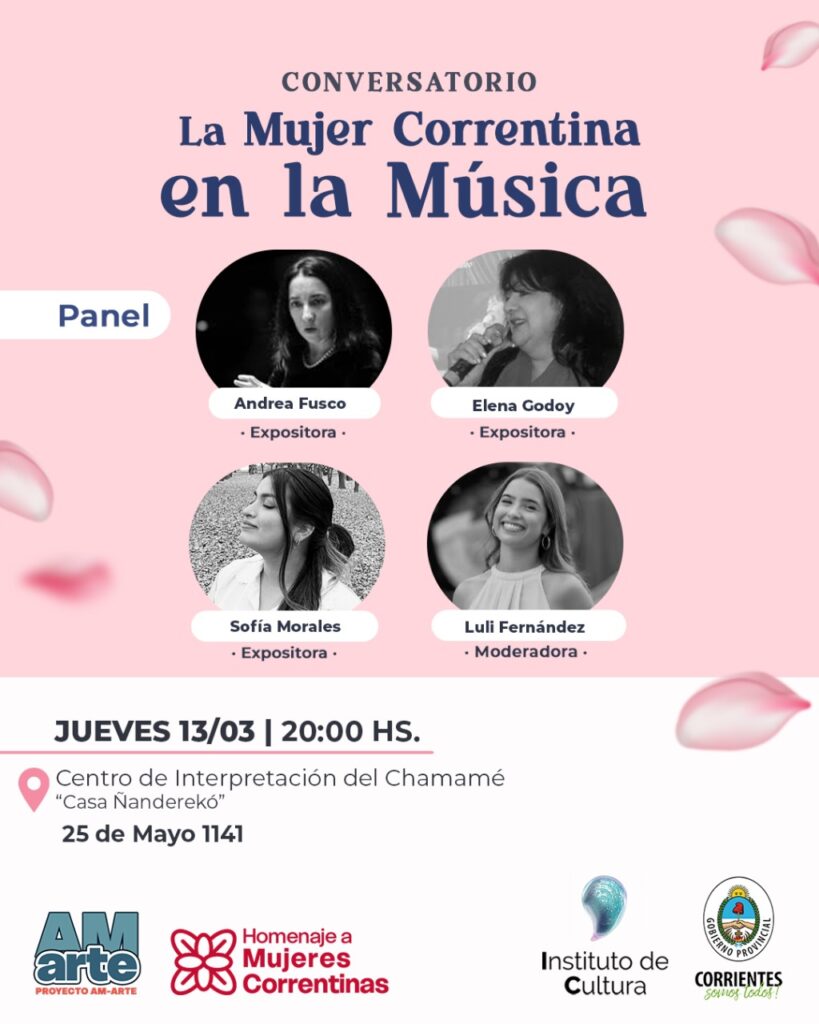 Este jueves 13 de marzo, a partir de las 20, tendrá lugar un conversatorio sobre «Las mujeres en la música de Corrientes». La cita será en Casa Ñanderekó, Centro de Interpretación del Chamamé (25 de Mayo 1141), con Luli Fernández como moderadora, y la participarán en el panel de Andrea Fusco, Elena Godoy y Sofía Morales.