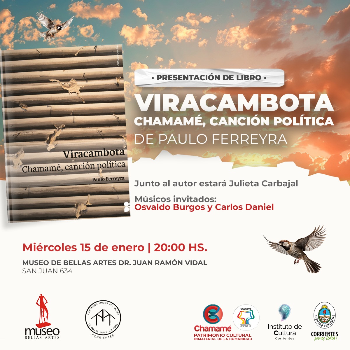 El miércoles 15 de enero, a las 20, en el marco de la 34ª edición de la Fiesta Nacional del Chamamé, 20ª Fiesta del Mercosur y 4ª Celebración Mundial se presentará “Viracambota. Chamamé, canción política” del periodista Paulo Ferreyra. La cita es en el Museo Provincial de Bellas Artes Doctor Juan Ramón Vidal. Estarán presentes el autor junto a la licenciada Julieta Carbajal para hablar del libro. Habrá música de la mano de Carlos Daniel y Osvaldo Burgos. El libro llega de la mano de la Universidad Nacional del Nordeste, Centro Cultural Universitario CCU y EUDENE.