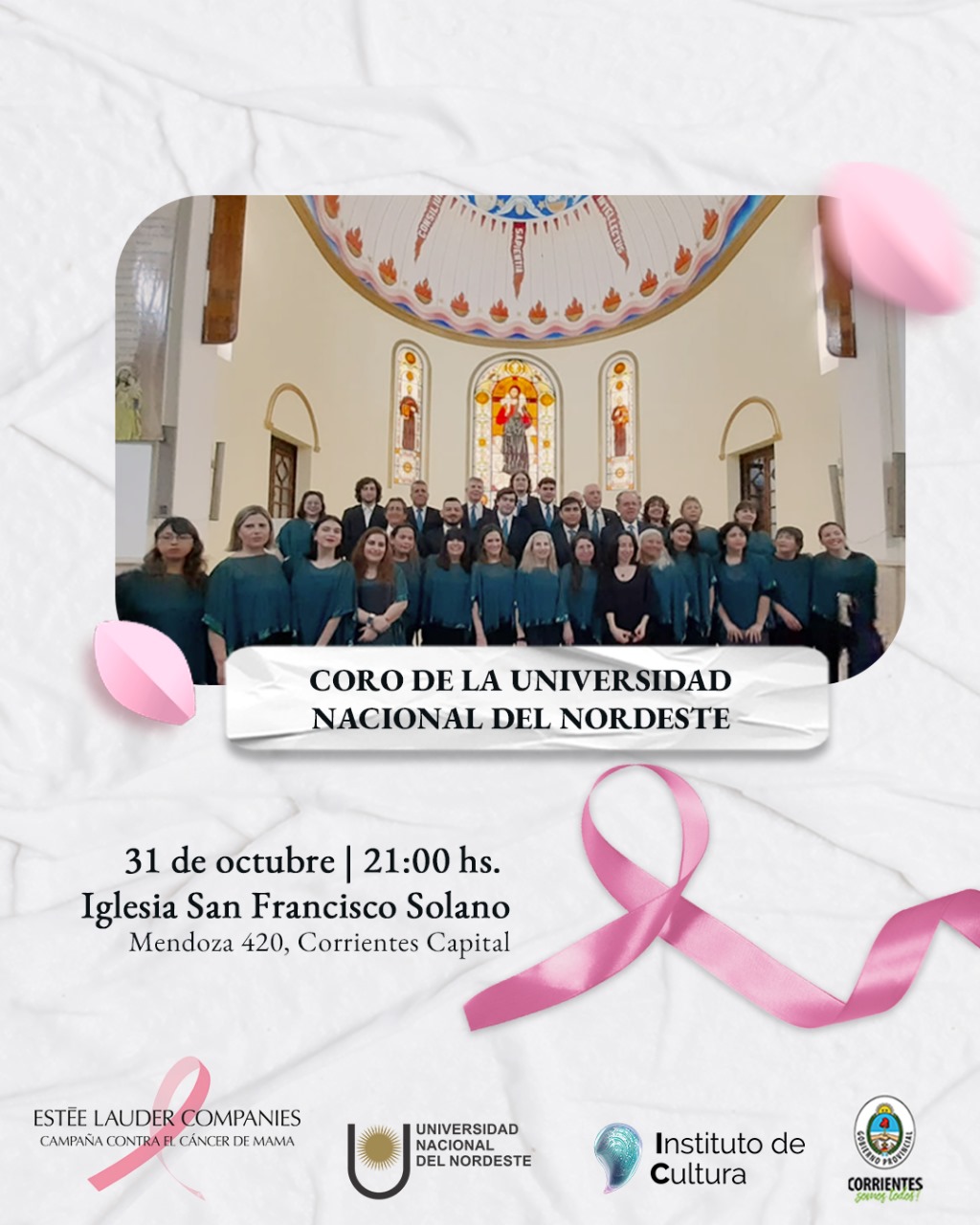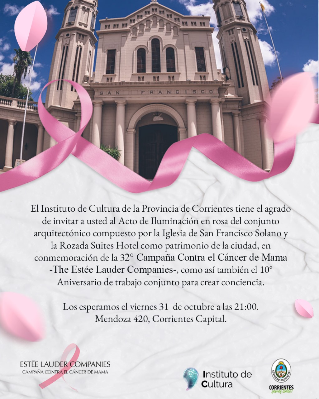 El Instituto de Cultura de Corrientes invita al acto de iluminación de rosa del conjunto arquitectónico formado por la Iglesia San Francisco Solano y la Rozada Suites Hotel, que se realizará el jueves 31 de octubre, a las 21, en el marco del cierre del Mes de Sensibilización sobre el Cáncer de Mama que se celebra en todo el mundo.