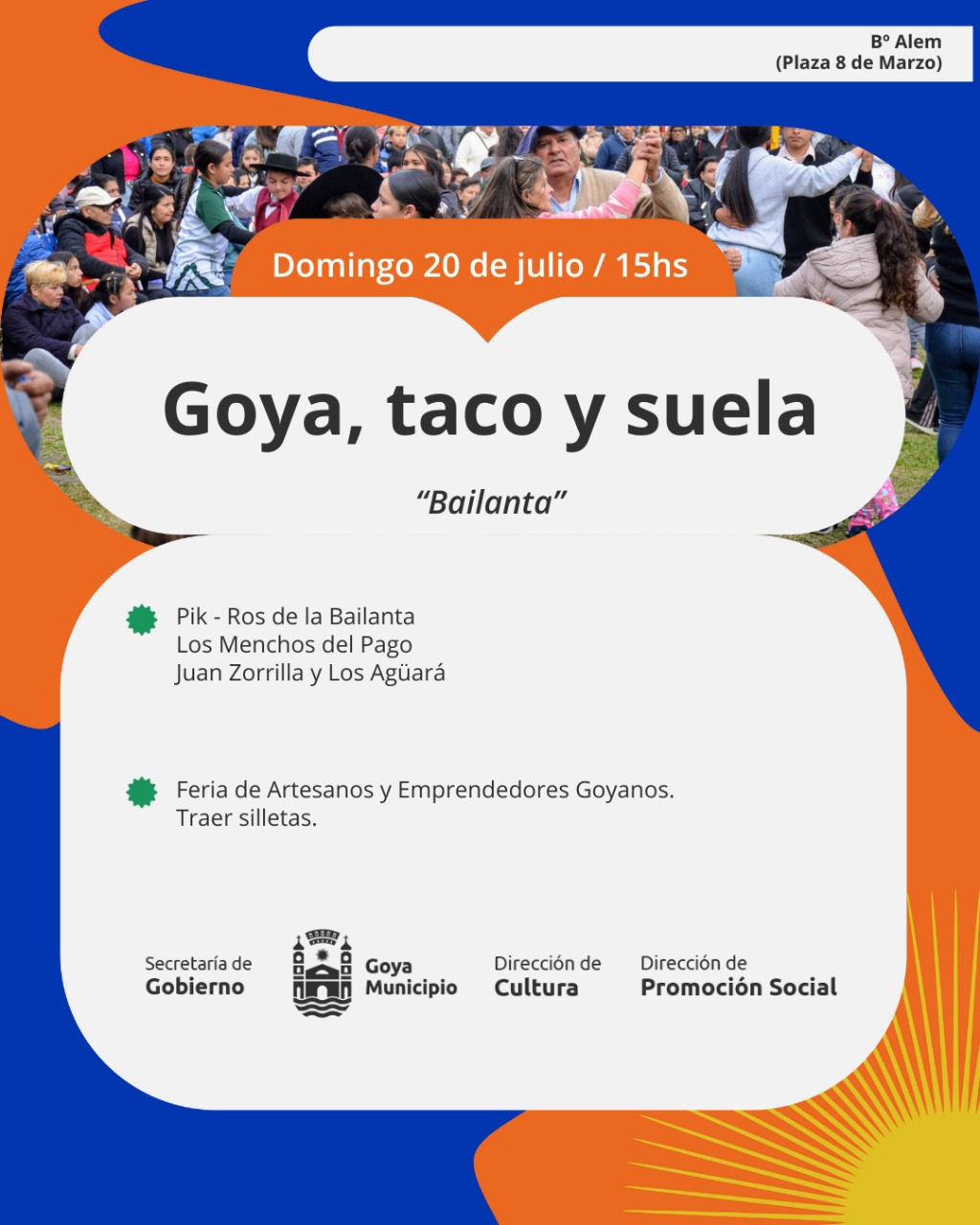 La Municipalidad de Goya invita a toda la comunidad a participar de una tarde a pura música, baile y tradición con la bailanta “Goya, taco, suela”, que se realizará este domingo 20 de julio, desde las 15 horas, en la plaza 8 de Marzo del Barrio Alem.