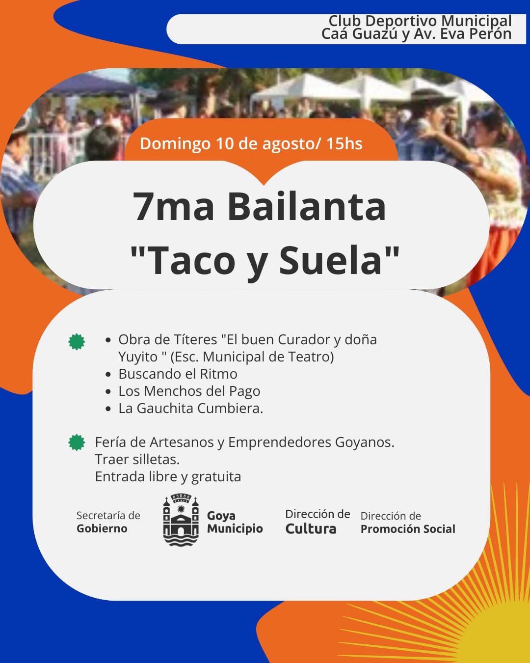 Con entrada libre y gratuita, se realizará la 7ª fecha del Taco y Suela en el Club Deportivo Municipal desde las 15 horas, el domingo 10, las únicas condiciones: ganas de bailar y llevar la silleta.