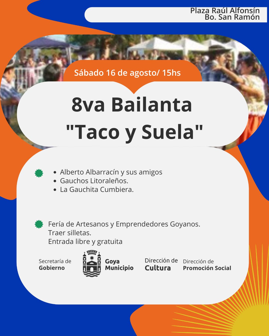 El programa del gobierno municipal continúa con su recorrido, llevando música y baile para todas las edades, con acceso libre y gratuito. Este sábado desde las 15:00 horas en la Plaza Raúl Alfonsín, del barrio San Ramón, se llevará a cabo el 8° encuentro La Bailanta del Taco y Suela.