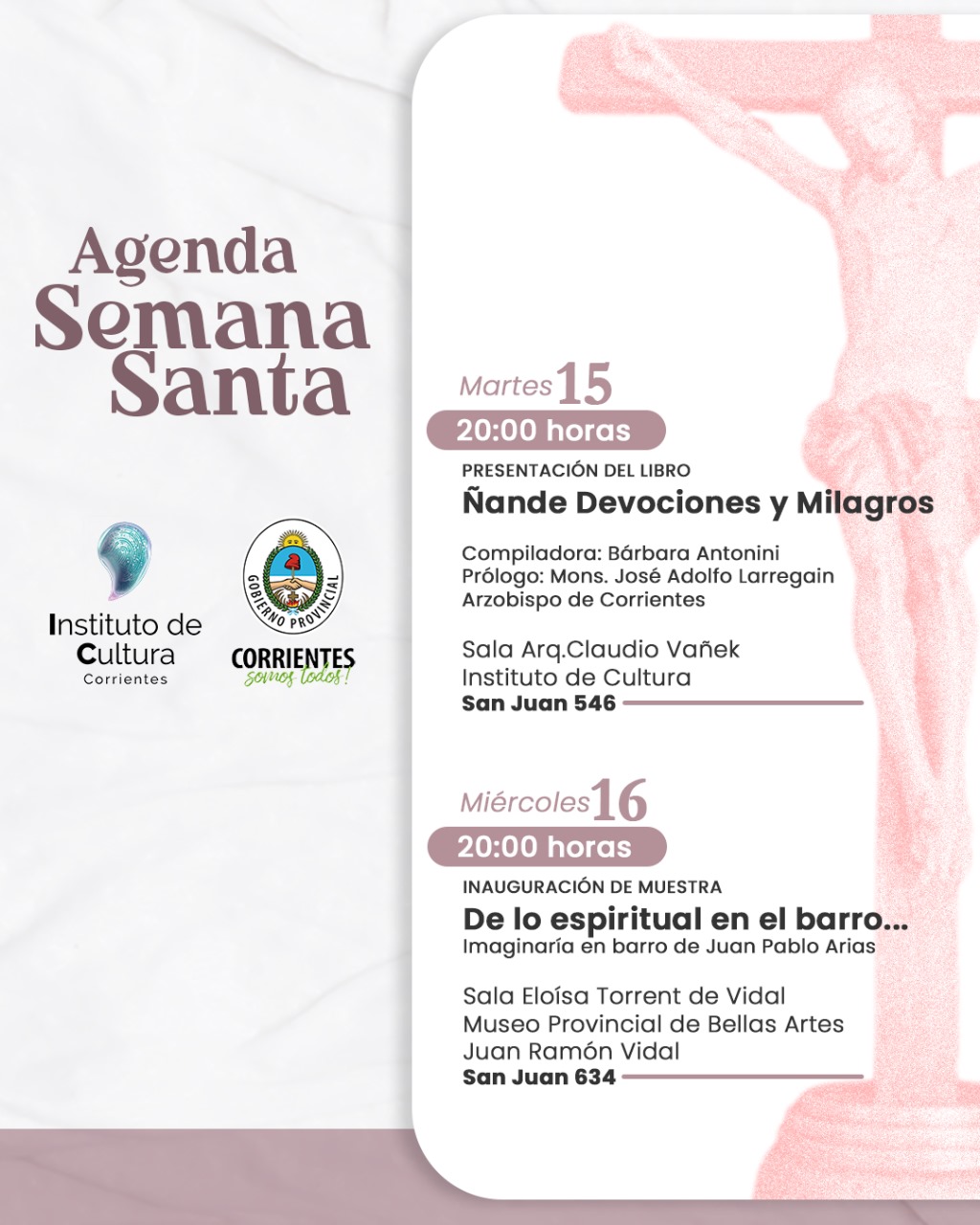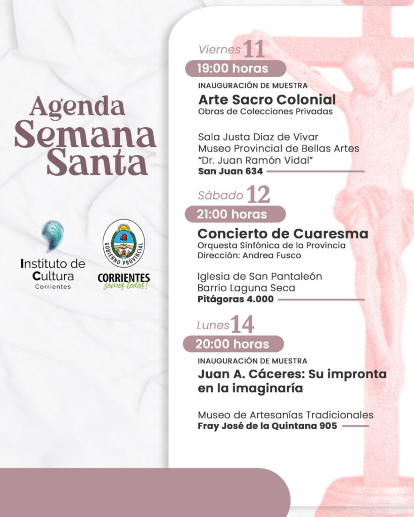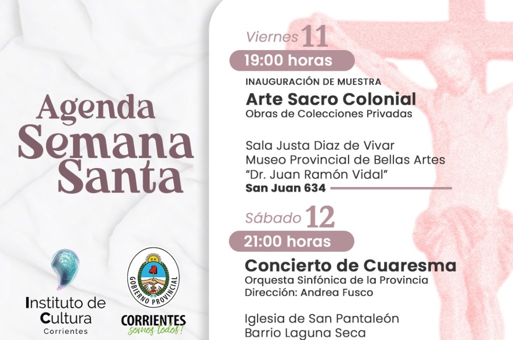El Gobierno de Corrientes, a través del Instituto de Cultura, organizó una atractiva programación de actividades para Semana Santa. A partir de este viernes 11 al miércoles 16 de abril, se habilitarán distintas muestras en museos provinciales, la Orquesta Sinfónica ofrecerá un Concierto de Cuaresma y se presentará el libro “Ñande Devociones y Milagros”.