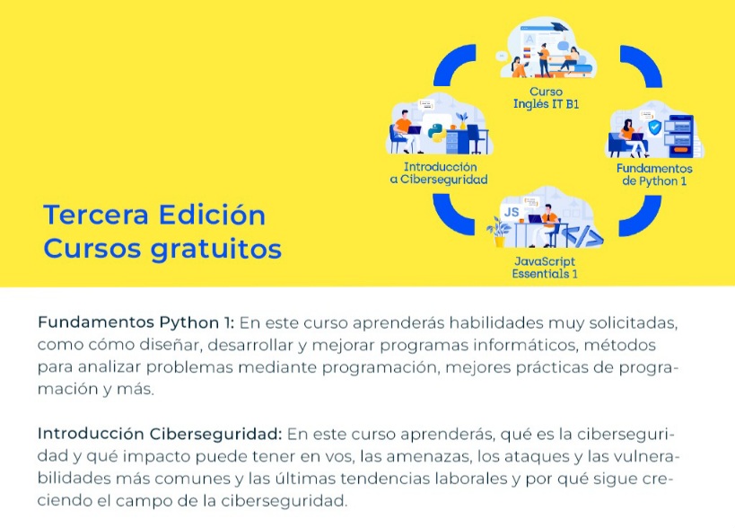 La Municipalidad de Goya a través de la Secretaría de Modernización invita a inscribirse a los cursos de formación relacionados a la Economía del Conocimiento. Estas 4 propuestasformativas son: Fundamentos Python 1; Introducción a Ciberseguridad; Introducción JavaScript Essentials 1 e inglés IT B1.