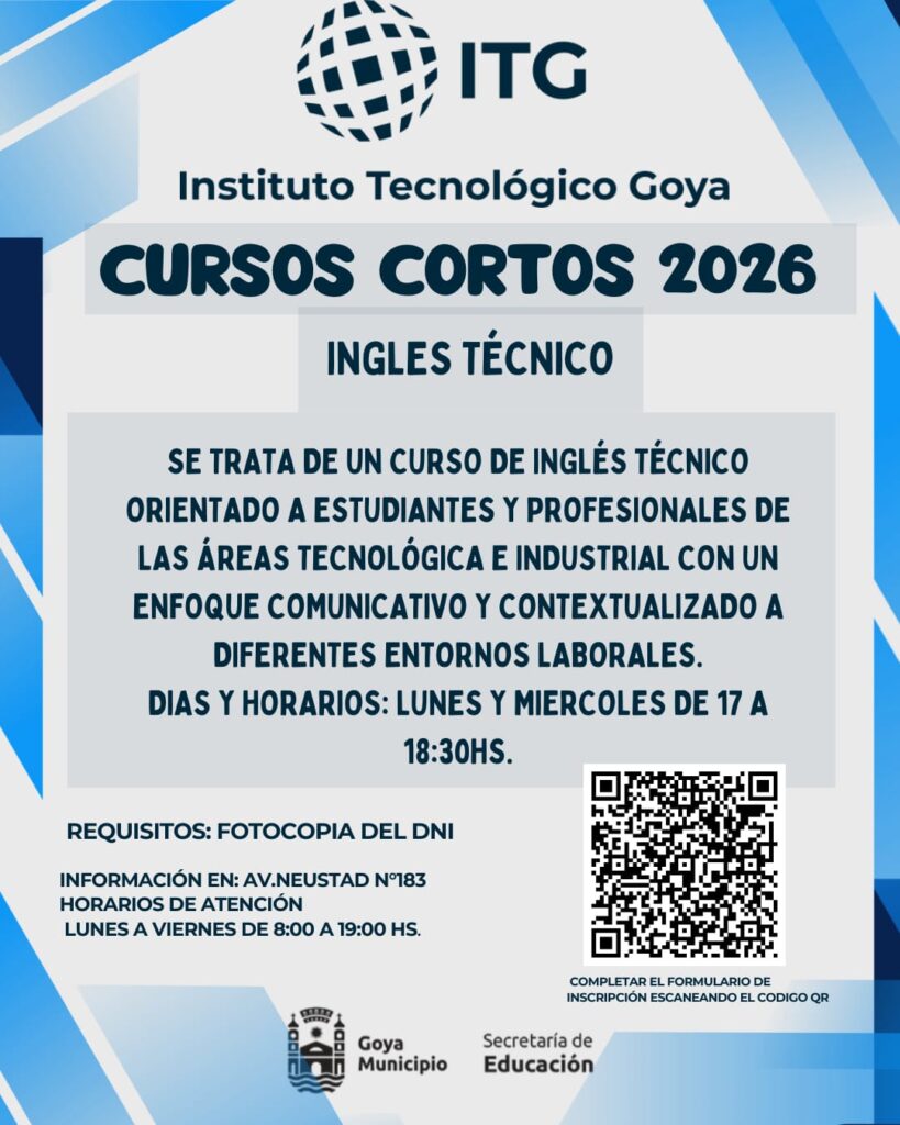 El Instituto Tecnológico Goya brinda a través de un curso corto la posibilidad de adquirir conocimiento de Inglés Técnico.