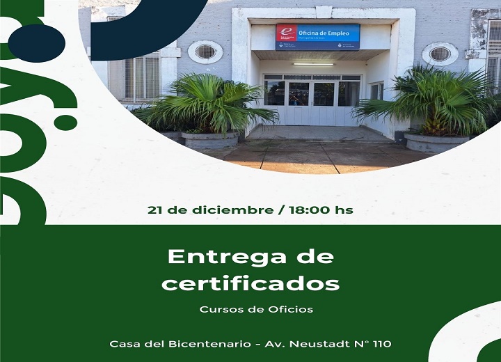 La Dirección de Empleo de la Municipalidad de Goya, bajo la dirección del doctor Damián Pini, comunica que la ceremonia de entrega de certificados de Cursos de Oficios se llevará a cabo mañana jueves 21 de diciembre en la Casa del Bicentenario, ubicada en la avenida Neustadt N° 110, a partir de las 18 horas.