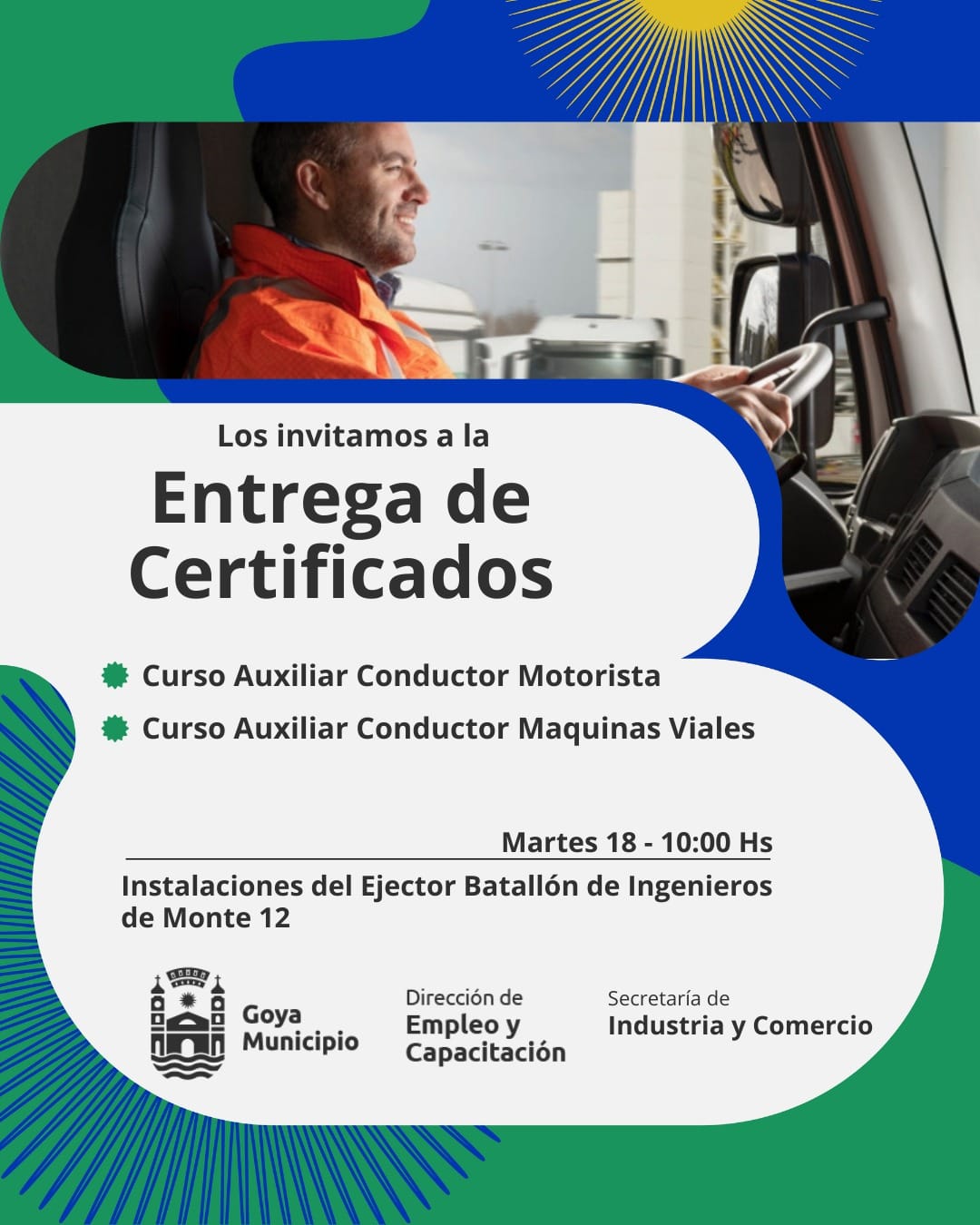 El martes 18 en el Batallón de Ingeniero de Monte 12 se entregarán los certificados de los cursos de capacitación en Auxiliar Conductor Motorista y Auxiliar Conductor Máquinas Viales.