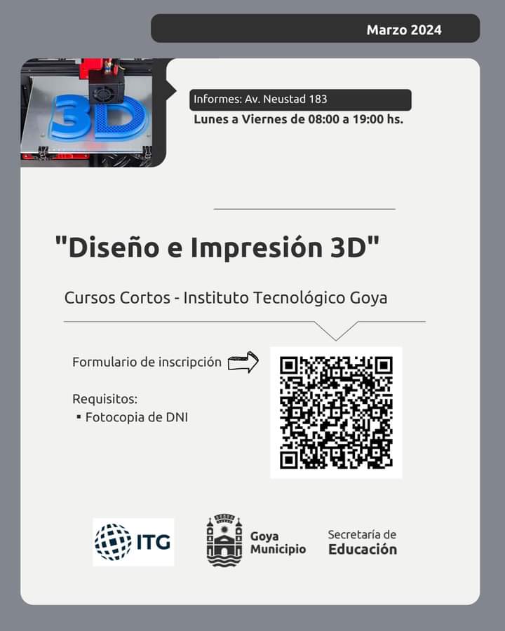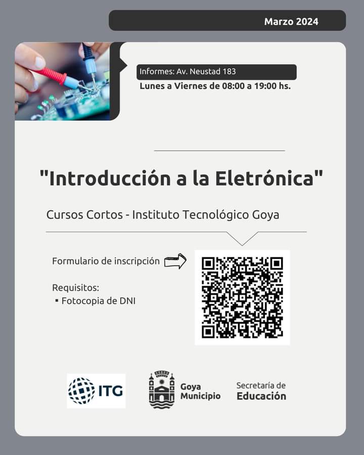 Estos cursos comenzarán la próxima semana y para inscribirse, los interesados pueden completar el formulario de preinscripción del Instituto Tecnológico Goya, el cual se encuentra disponible en su Instagram o en su página de Facebook: https://www.facebook.com/ institutotecnogoya . A través de un código QR, se podrá acceder al formulario e información adicional: https://docs.google.com/forms/d/e/1FAIpQLSewx5cp2JhwZLXun0FayXnrqPph-pOMSvSFkNzuf3tl0nAq2Q/viewform?usp=sf_link
