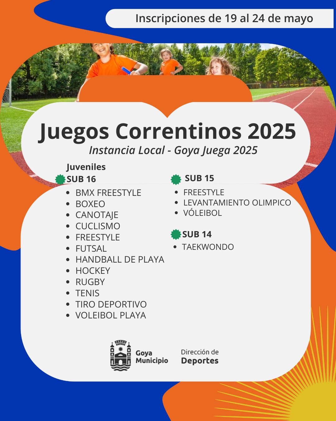 Desde la Dirección de Deportes de la ciudad de Goya, informan fecha de inscripción para participar de la edición local, de los juegos correntinos edición 2025 .Las fechas establecidas para las inscripciones será del 19 al 24 de Mayo, para las categorías juveniles.