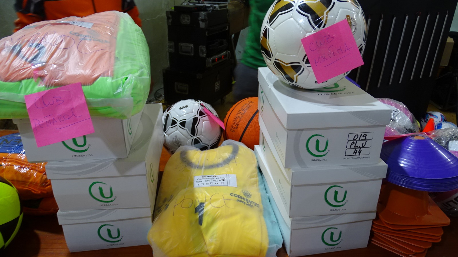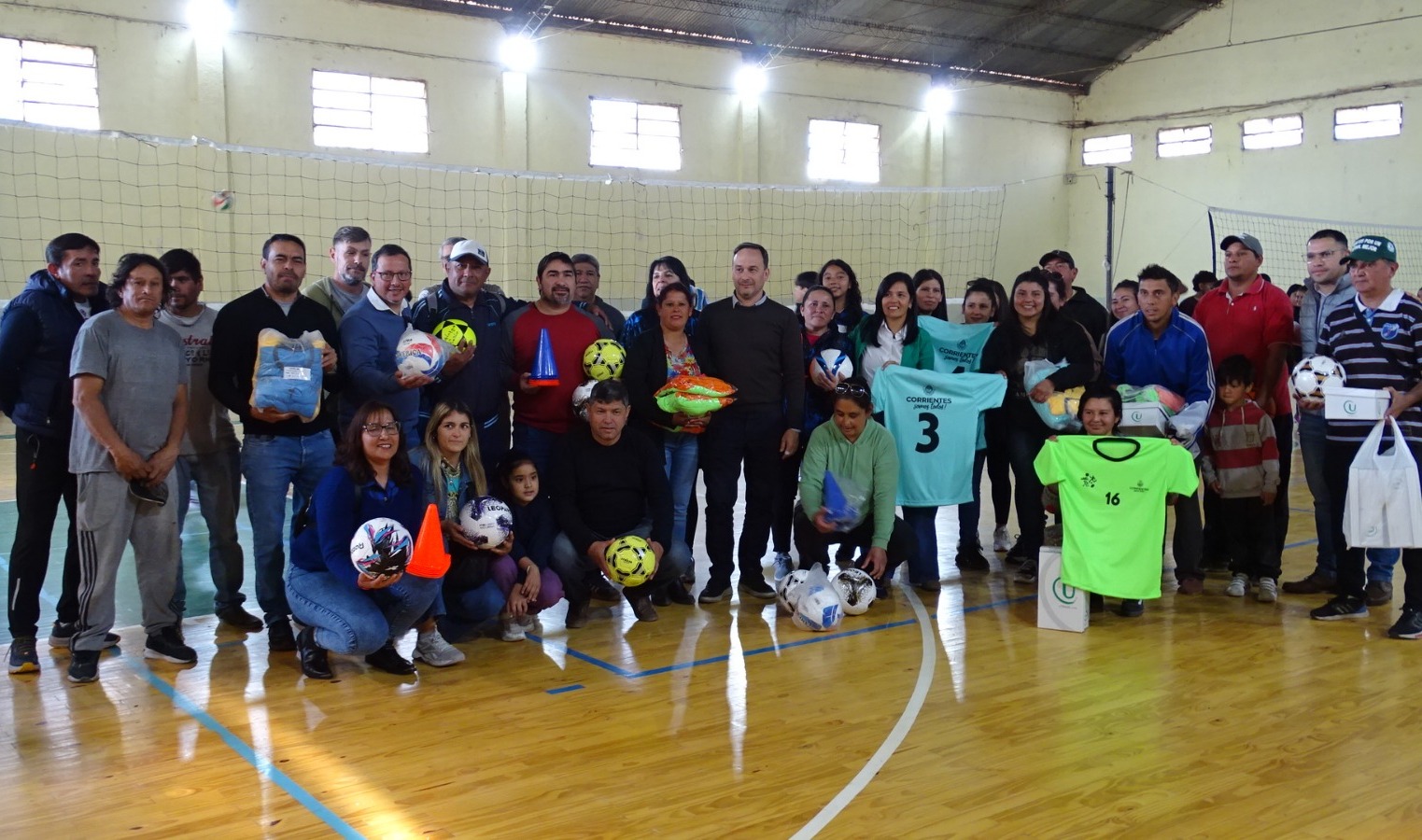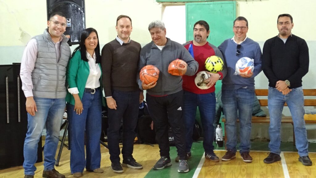 Los destinatarios recibieron pelotas de fútbol, básquet y Newcom, botines, juegos de camisetas, medias, conos, tortugas, todo destinado a la práctica deportiva de cada institución.