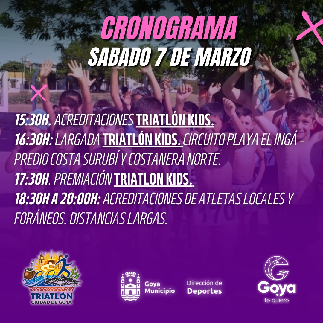 La ciudad de Goya se prepara para el Triatlón Ciudad de Goya, un evento que promete un fin de semana de intensa actividad deportiva. El director de Deportes Alejandro Lago explicó que el sábado estará dedicado a la categoría infantil, con distancias adaptadas para los más pequeños. «Decidimos hacer el sábado para la categoría infantil con distancias adaptadas a ellos. La familia viene acompañando muy bien, y ese día en la playa El Inga vamos a estar con los más pequeños», detalló. Tras la premiación infantil, se dará inicio a la acreditación de los atletas que el domingo competirán en las distancias largas, tanto locales como foráneos. El domingo será para el triatlón individual, distancias largas y por equipos.