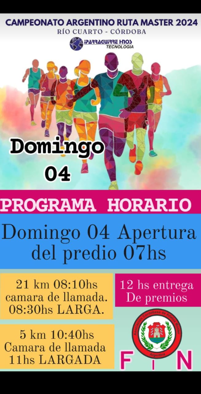 El Campeonato Argentino de Ruta se corre en Rio Cuarto Córdoba, se disputa en dos días, sábado se disputó los 10 kilómetros, el domingo desde las 8 horas los 21 kilómetros, en horas de la tarde los 5K, y una carrera de una milla (1600 metros), es un torneo Master para más de 30 años.