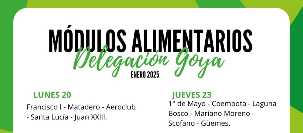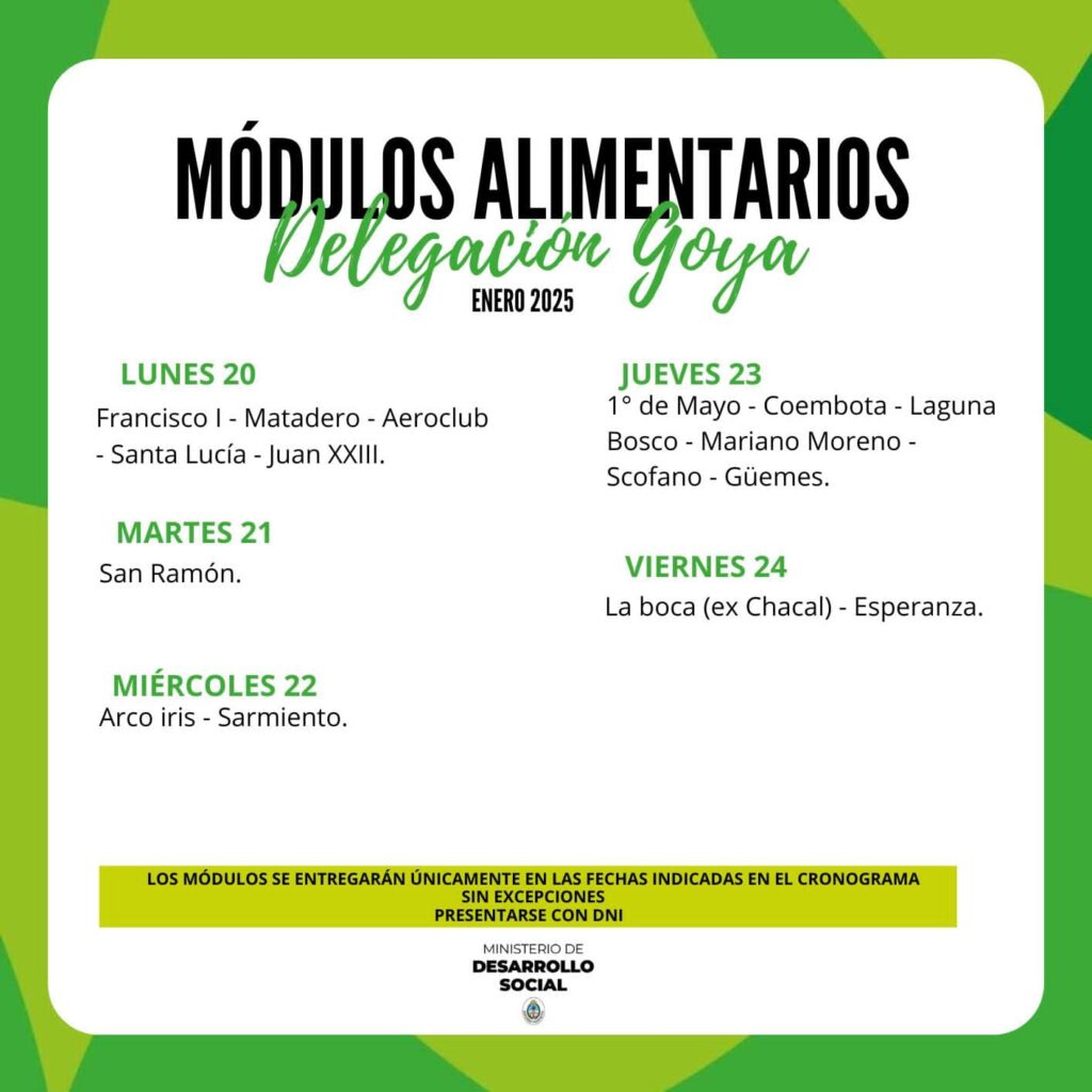 Esta semana continúa la entrega de los Módulos Alimentarios a los beneficiarios de los distintos barrios de la ciudad, en las oficinas de la Delegación Goya sito en Avenida Mazzanti 555 en el horario de 8 a 12 horas.