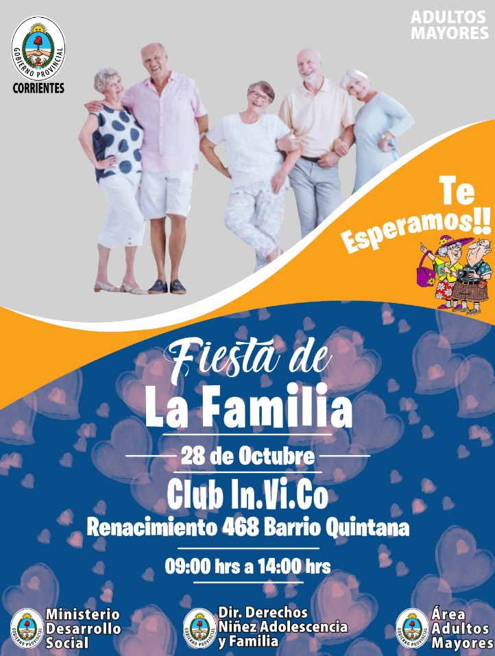 Los clubes de adultos mayores dependientes del Ministerio de Desarrollo Social de la Provincia celebrarán este lunes 28 de octubre, de 9 a 14 horas, el cierre del Mes de la Familia con una gran Fiesta. La misma será en el Club INVICO (Instituto de Vivienda de Corrientes), sito en la calle Renacimiento 468 del barrio Quintana de la ciudad de Corrientes.