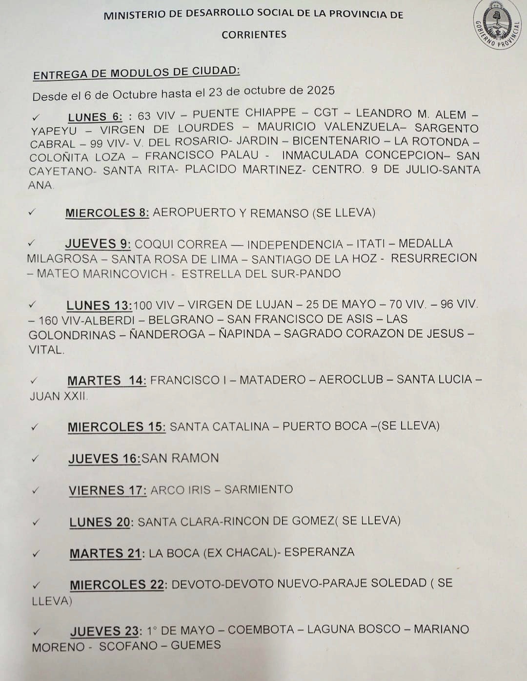 La Delegación Goya de Desarrollo Social informa el cronograma de entrega de módulos alimentarios desde el 6 de octubre hasta el 23 de octubre de 2025. Los módulos se entregarán únicamente en las fechas indicadas en el cronograma. Sin excepciones, presentarse con DNI