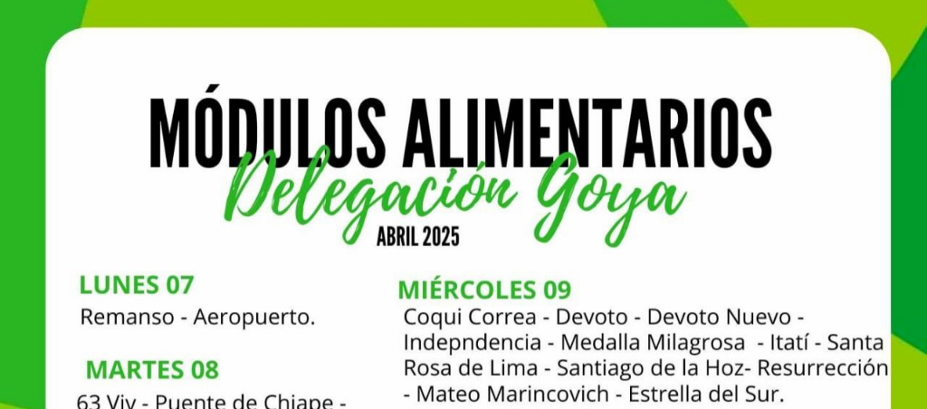 A partir del próximo lunes 7 de abril la Delegación Goya de Desarrollo Social iniciará la distribución de los Módulos Alimentarios correspondiente al mes de abril, a los beneficiarios de los distintos barrios de la ciudad.