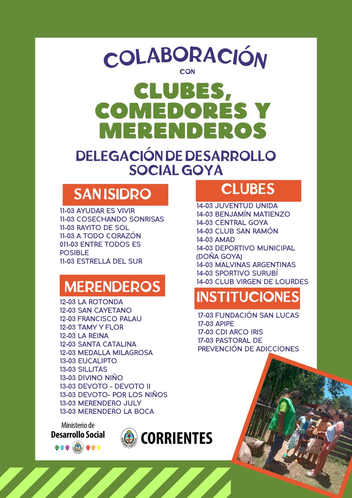 A partir del próximo martes 11 de marzo la Delegación Goya del Ministerio de Desarrollo Social iniciará la distribución de los insumos e ingredientes destinados a los comedores comunitarios, merenderos, instituciones y clubes que mensualmente aporta la mencionada repartición provincial, con asiento en la ciudad.