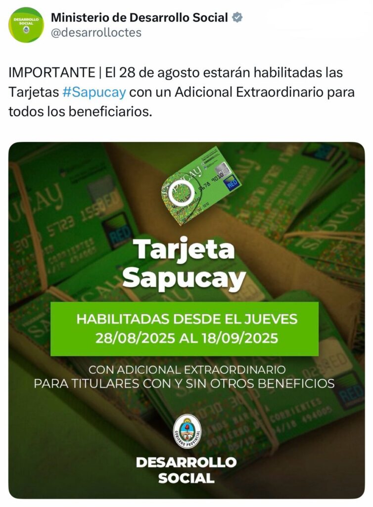 El Ministerio de Desarrollo Social informó que con un adicional extraordinario a partir del jueves 28 se habilita el pago de la Tarjeta Sapucay.