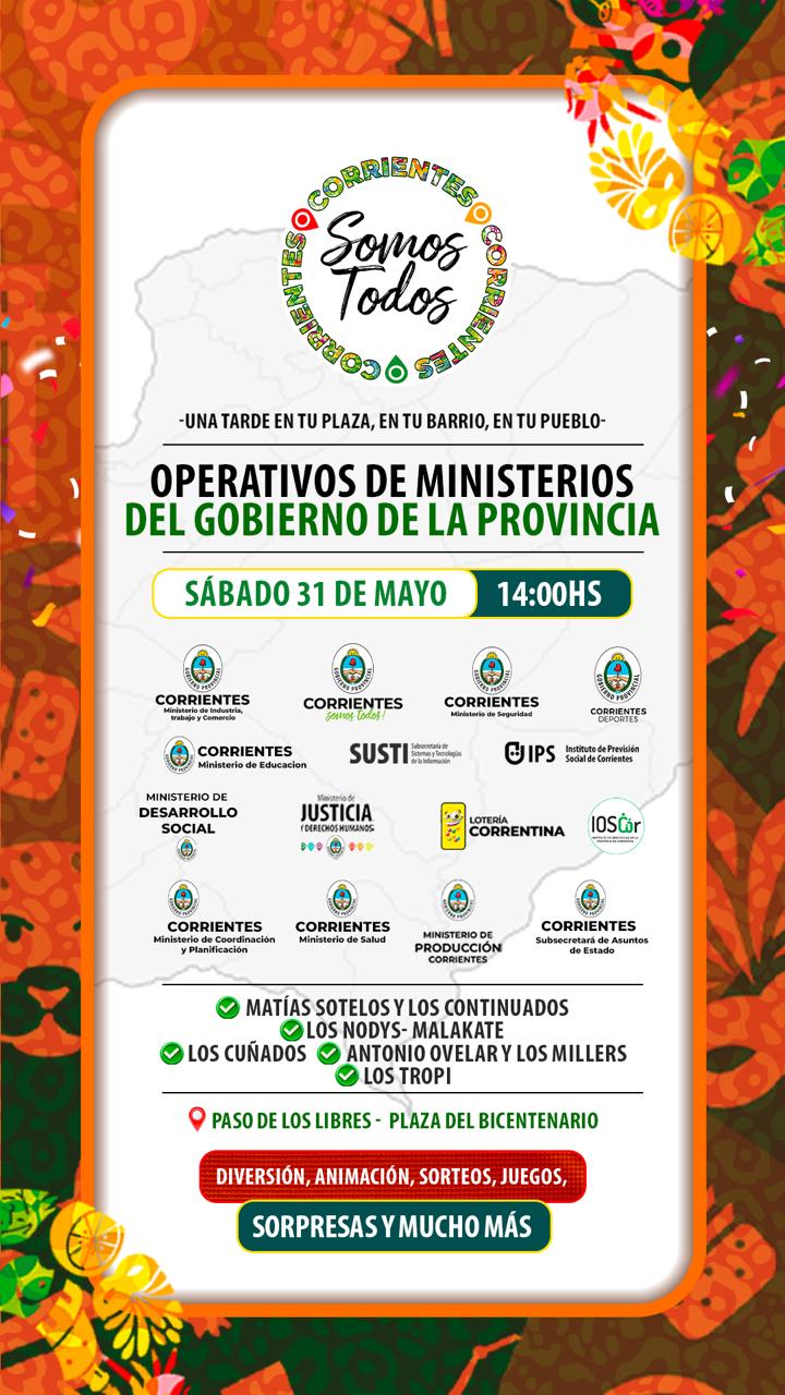 Este sábado 31 de mayo, a partir de las 14, el Gobierno de Corrientes llevará adelante un importante operativo integral “Una tarde en tu plaza, en tu barrio, en tu pueblo”, en la localidad de Paso de los Libres, donde también habrá shows en vivo, juegos y sorteos.