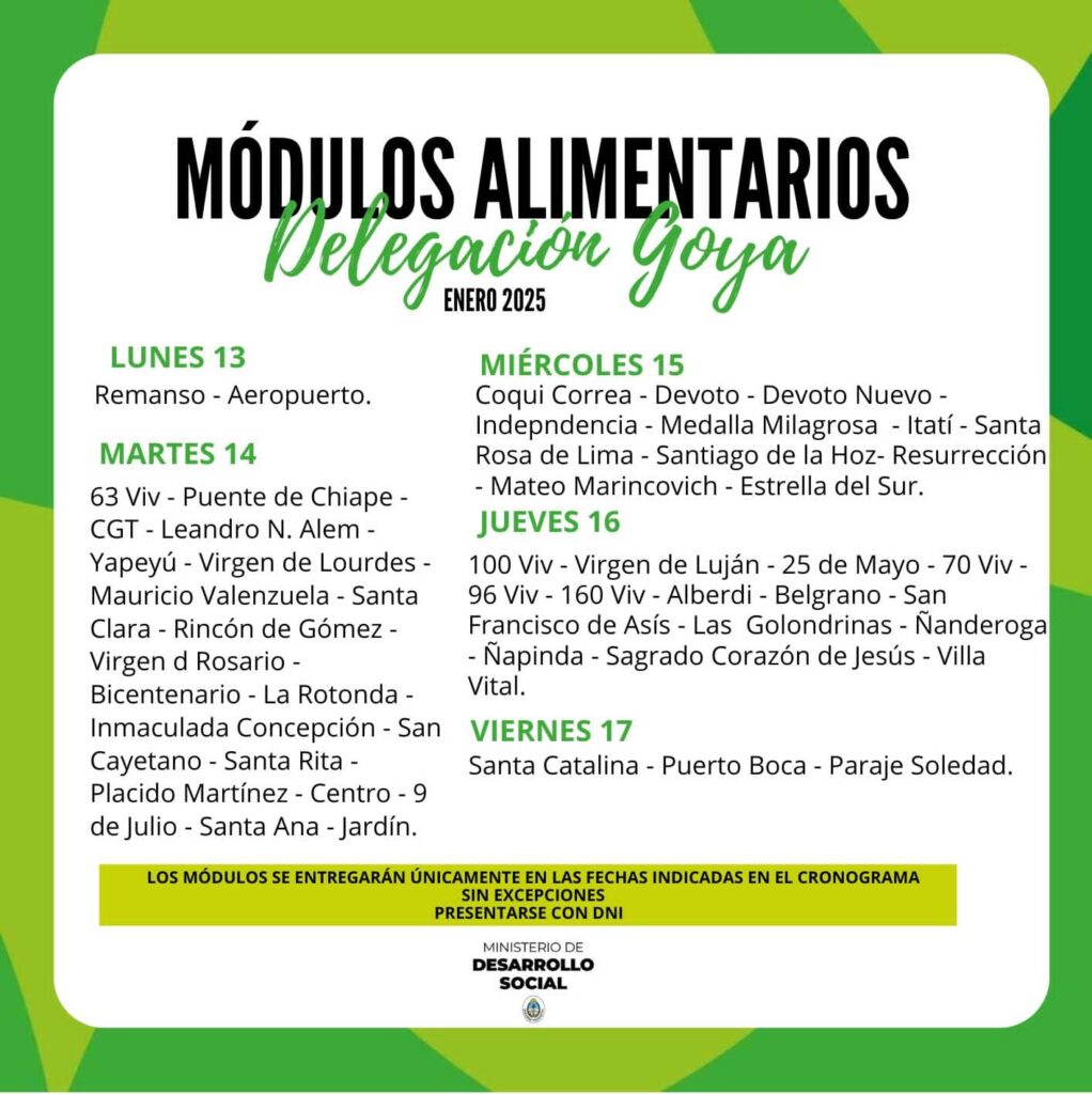 La Delegación Goya del Ministerio de Desarrollo Social desde el próximo lunes iniciará la entrega de Módulos Alimentarios a los beneficiarios de los distintos barrios de la ciudad.