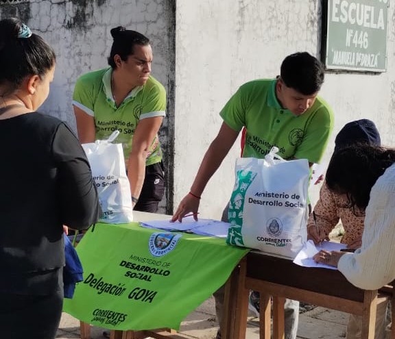 El personal de la delegación Goya de Desarrollo Social, además del relevamiento socio-ambiental de las familias, para completar la base de datos respectiva, procedió a la distribución de los Módulos Alimentarios y la entrega de Kits Femeninos.