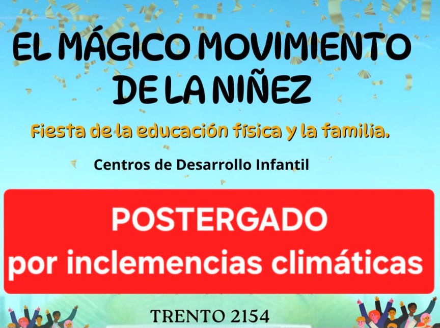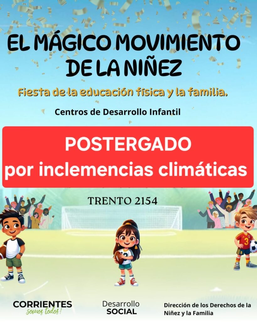 La Fiesta de la Educación Física y la Familia de los Centros de Desarrollo Infantil, ha sido postergada por las inclemencias climáticas en la fecha. La misma debía realizarse este jueves a las 19, en el Estadio Club Boca Unidos de Corrientes.