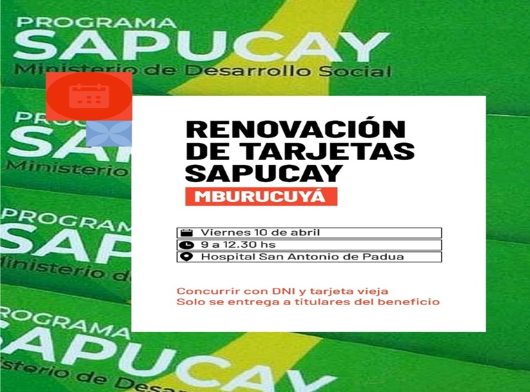 Este viernes 10 de abril de 9 a 12,30 hs, se llevará a cabo la renovación del plástico de las tarjetas Sapucay, a beneficiarios de la localidad de Mburucuyá que ya estén vencidas. Será en el predio del Hospital San Antonio de Padua.