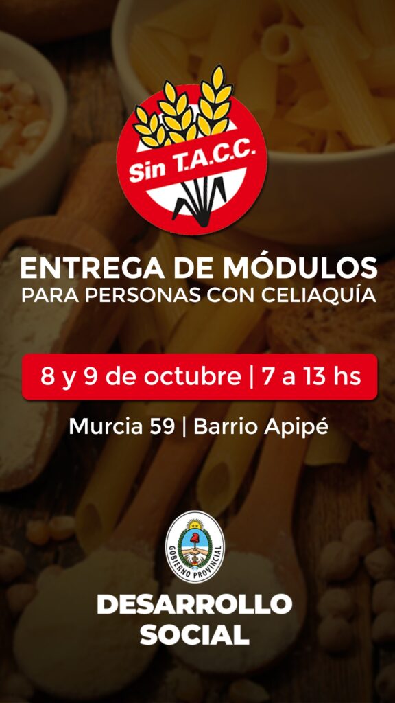 Los días 8 y 9 de octubre se hará la entrega de módulos alimentarios para celíacos en el depósito del Ministerio de Desarrollo Social, sito en Murcia 59 del Barrio Apipé.
