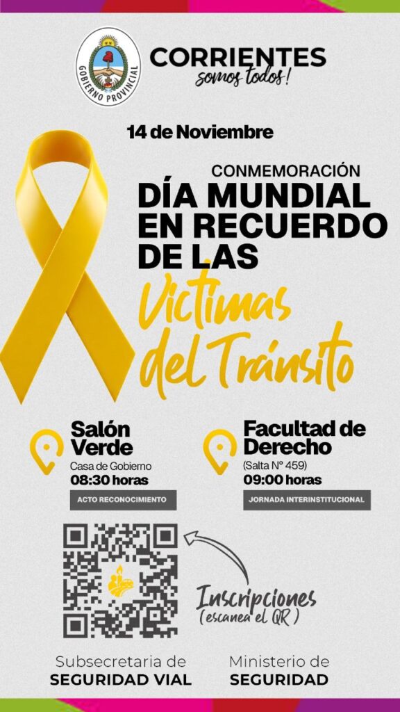 Al término del acto, se dará inicio a la Jornada Interinstitucional en Conmemoración del “Día Mundial en Recuerdo de las Víctimas de Tránsito”, que tendrá lugar en el Auditorio del Edificio Histórico de la Facultad de Derecho, Ciencias Sociales y Políticas de la UNNE (Salta 459).