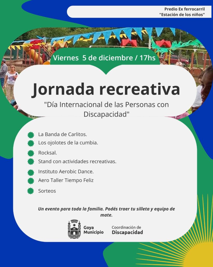 En este marco, la Coordinación de Discapacidad de la Municipalidad de Goya anunció la realización de una Jornada Recreativa este viernes 5 de diciembre, a las 17 horas, en el Predio Ex Ferrocarril ‘Estación de los Niños’, un espacio que se prepara para recibir a familias, instituciones y a toda la comunidad en una tarde pensada para compartir, disfrutar y celebrar.