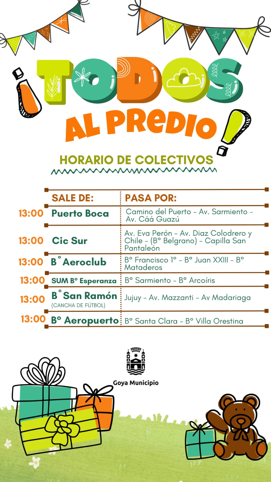 Para facilitar el acceso de los niños de la ciudad y el campo se ha dispuesto servicio de colectivos en puntos estratégicos de la ciudad y en cada una de las secciones de los parajes de la zona rural, en ambos casos la partida de los micros está fijada a las 13 horas