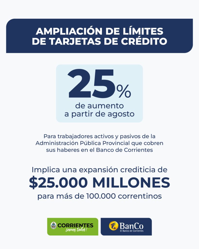 Además, adelantó que se aumentarán los límites de consumo en tarjetas de crédito para los trabajadores provinciales que tengan un límite actual por debajo de 6.400.000 pesos, lo cual “otorga mayor crédito” a quienes lo necesitan”.
