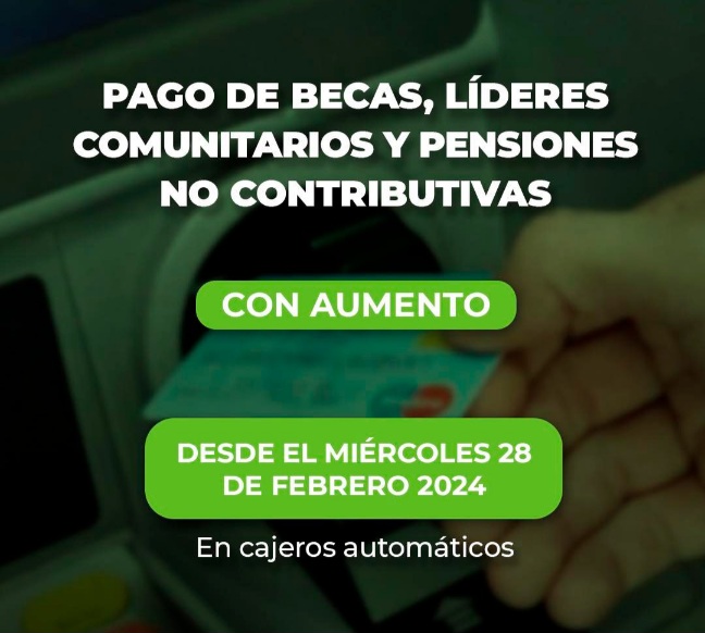 El Ministerio de Desarrollo Social Informa a beneficiarios, que desde este miércoles 28 de febrero del 2024 estará disponible el pago de Becas, Pensiones No Contributivas y Líderes Comunitarios dependientes de este organismo.