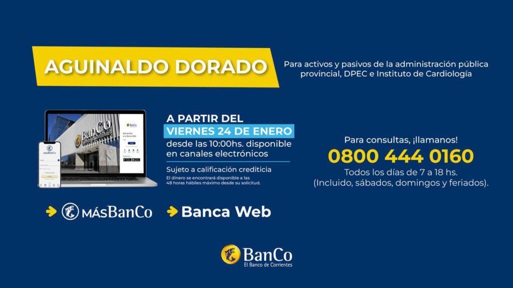Desde este viernes 24 de enero está habilitado el anticipo de aguinaldo del Banco de Corrientes(BanCo), correspondiente al Sueldo Anual Complementario (SAC) de junio de 2025.