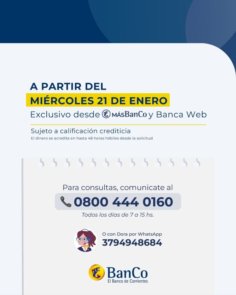 El monto estará disponible, como máximo, a las 48 horas hábiles de haberlo solicitado. Para más información las personas interesadas podrán ingresar a www.bancodecorrientes.com.ar, comunicarse con el Contact Center (0800 444 0160) todos los días de 7 a 15, o bien el chat bot “Dora”, vía Whats App: 3794 948684.