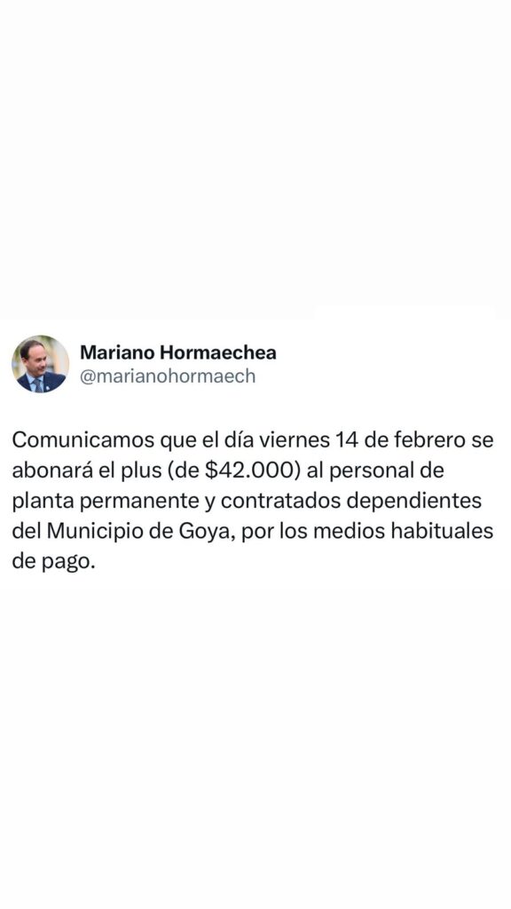 “Comunicamos que el día viernes 14 de febrero se abonará el plus ($42.000) al personal de planta permanente y contratados dependientes del Municipio de Goya, por los medios habituales de pago”, expresó el jefe comunal en su mensaje oficial.