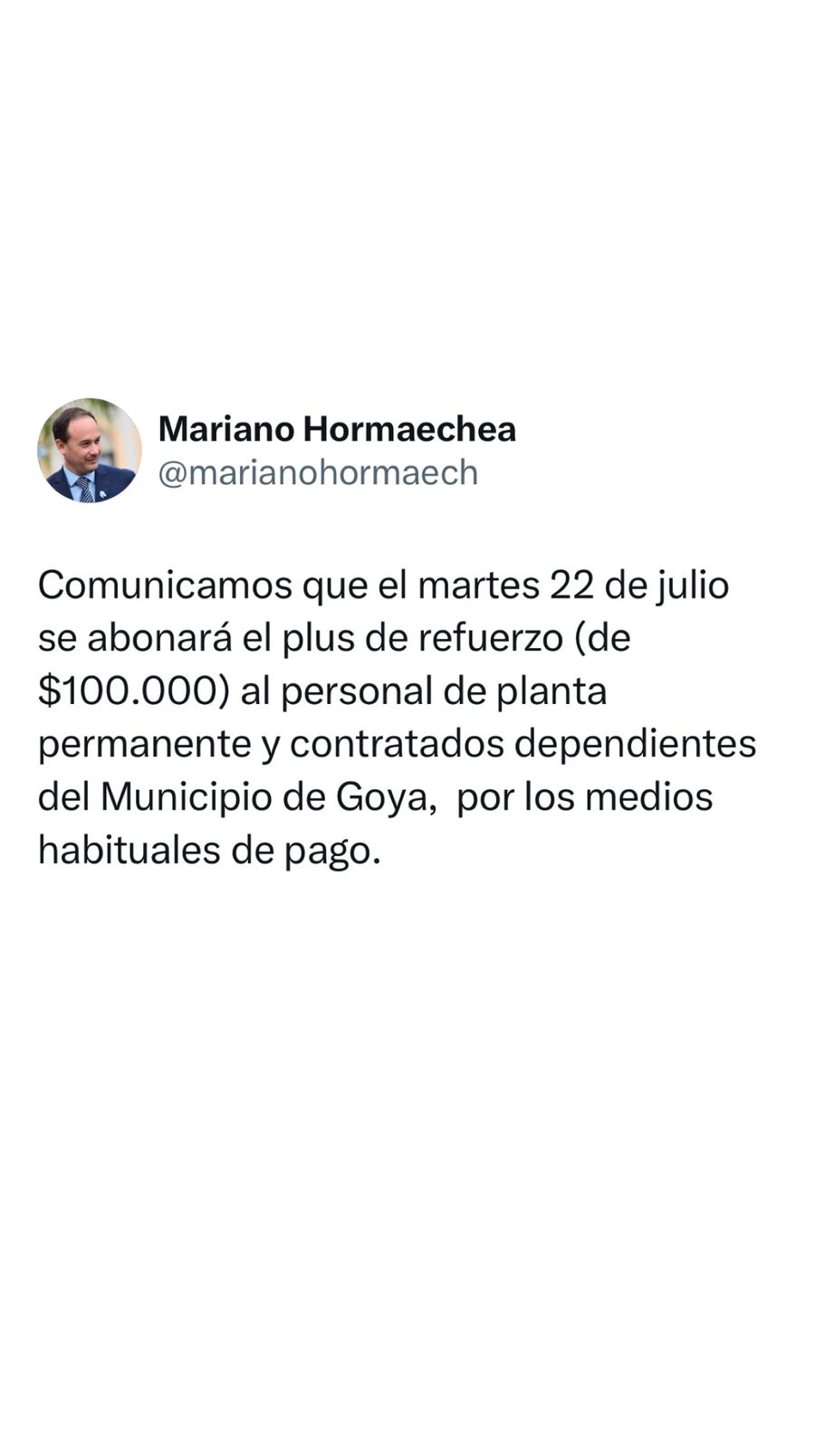 El jefe comunal Mariano Hormaechea expresó en su mensaje: “Comunicamos que el martes 22 de julio se abonará el plus de refuerzo (de $100.000) al personal de planta permanente y contratados dependientes del Municipio de Goya, por los medios habituales de pago.”