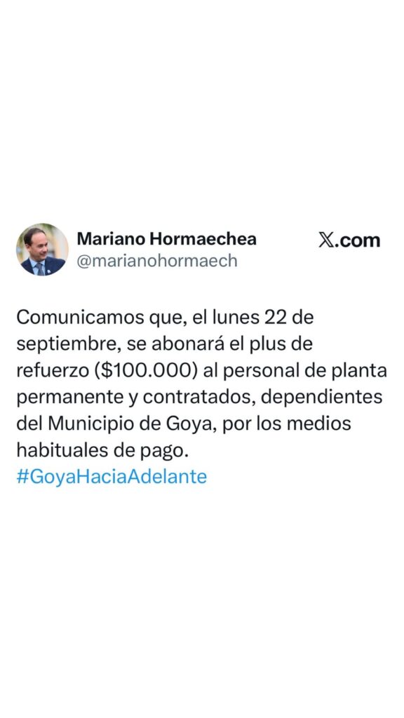 El Mandatario Local, en sus redes informó: “Comunicamos que el lunes 22 de septiembre, se abonará el plus de refuerzo ($100.000) al personal de planta permanente y contratados, dependientes del Municipio de Goya, por los medios habituales de pago.”