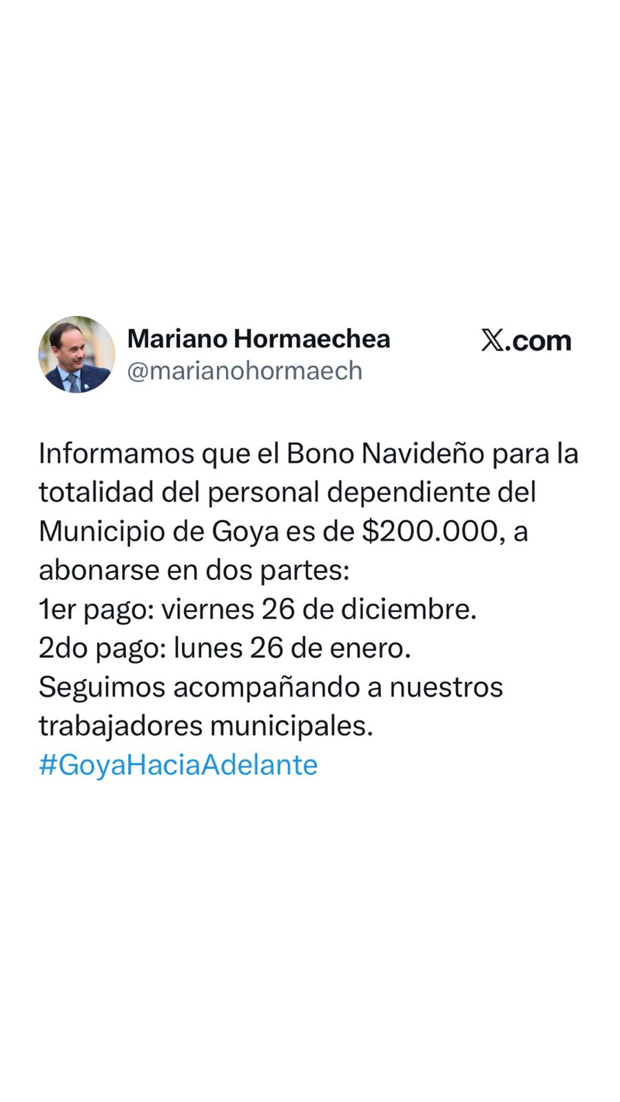 El intendente de Goya, doctor Mariano Hormaechea, anunció a través de sus redes sociales el pago de un bono de $200.000 destinado a todos los empleados municipales, con motivo de las fiestas de fin de año.