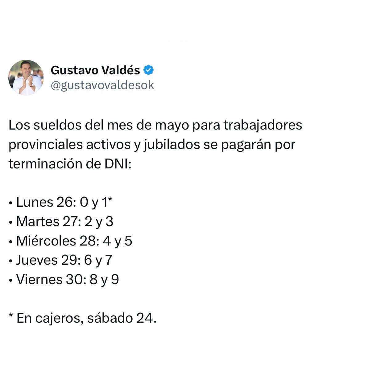 El primer mandatario correntino Gustavo Valdés comunicó, a través de sus redes sociales @gustavovaldesok, el cronograma de pago del sueldo de mayo, en cinco días, entre este lunes 26 y el viernes 30. Alcanza a todos los agentes de la administración pública provincial, activos, jubilados y pensionados.