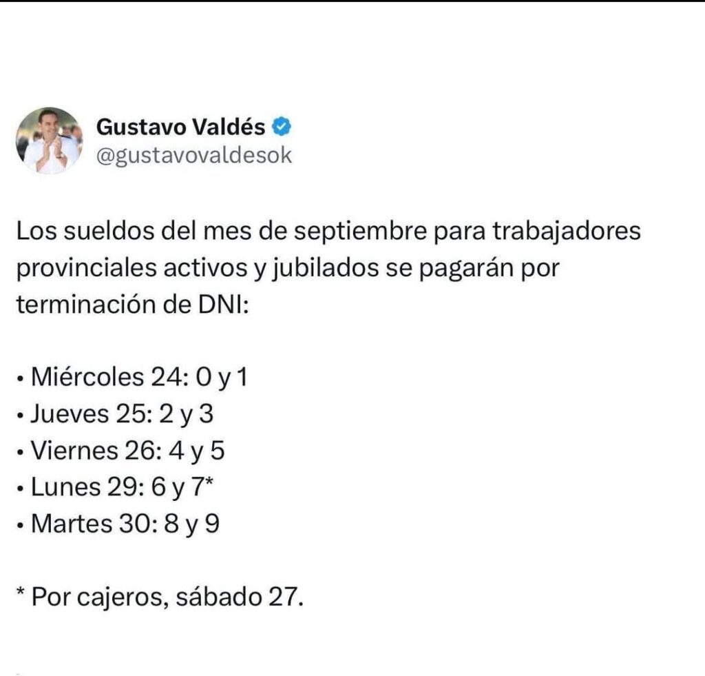 El primer mandatario provincial Gustavo Valdés dio a conocer los días de pago del sueldo correspondiente a septiembre, entre este miércoles 24 y martes 30. El beneficio alcanza a los agentes activos, jubilados y pensionados.