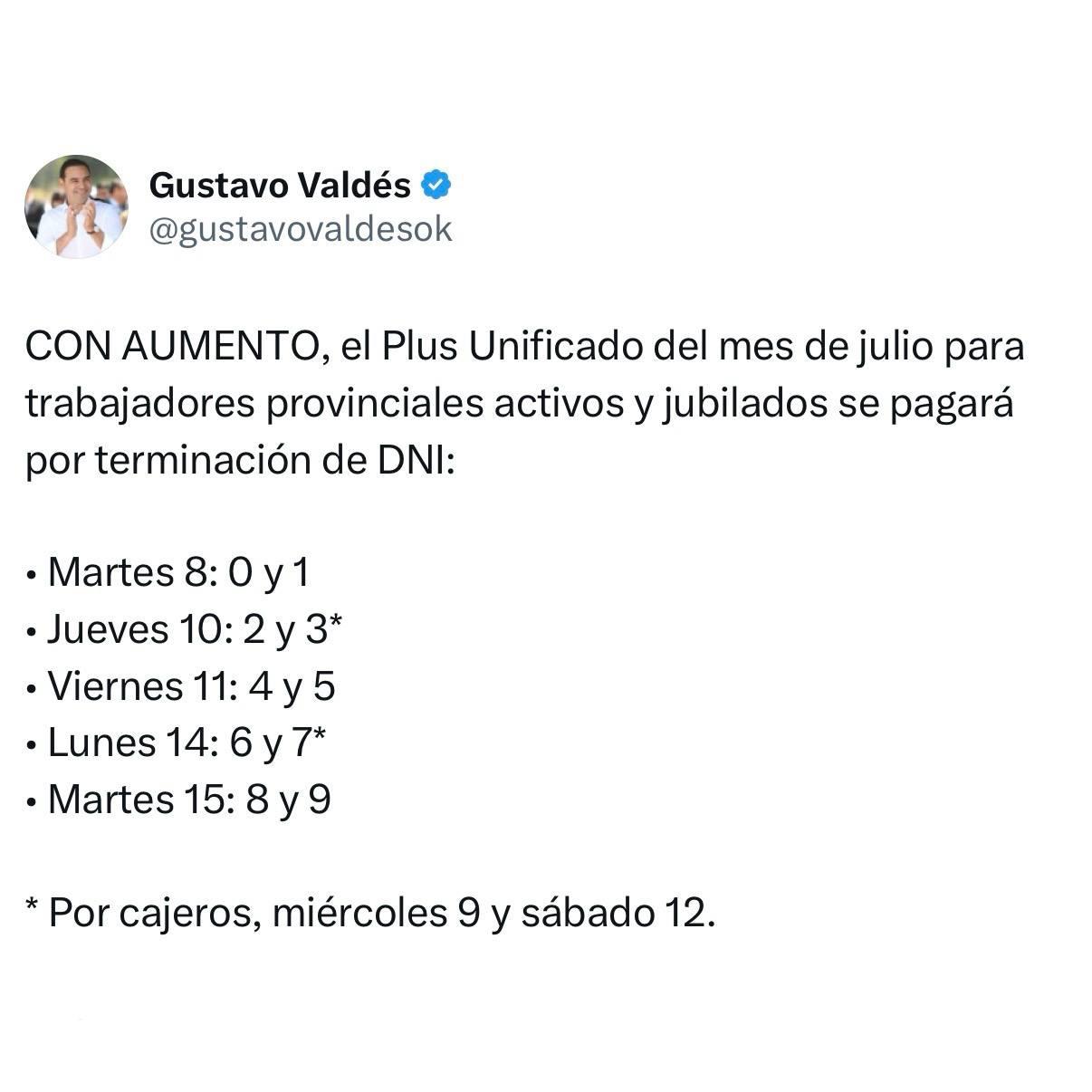 El gobernador Gustavo Valdés anunció este jueves a través de sus redes sociales el cronograma de pago del Plus Unificado correspondiente al mes de julio para los trabajadores activos y jubilados de la administración pública provincial. Con un aumento del 100% respecto al mes anterior, el beneficio se abonará por terminación de Documento Nacional de Identidad.