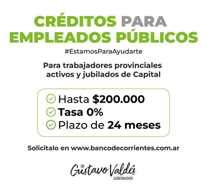 El gobernador Gustavo Valdés anunció este miércoles a través de su cuenta de X que el Gobierno provincial lanzó una nueva línea de créditos del Banco de Corrientes. La misma está destinada a trabajadores provinciales activos y jubilados de la ciudad Capital, otorgando hasta $200.000 a tasa 0% a pagar en un plazo en 24 meses.