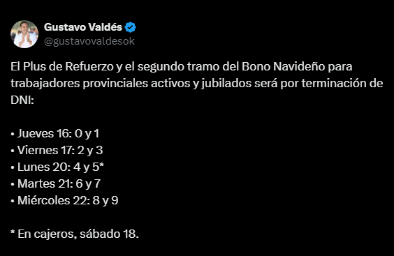 A través de sus redes sociales @gustavovaldesok, el primer mandatario correntino Gustavo Valdés informó los días de pagos, en simultáneo, de los $50 mil del Plus de Refuerzo correspondientes a enero, y del segundo tramo del Bono Navideño, que son $200.000 por agente de la administración pública provincial.