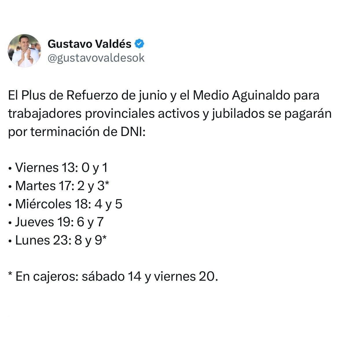El gobernador de Corrientes, Gustavo Valdés, anunció el cronograma unificado de pago del medio aguinaldo y del Plus de Refuerzo correspondiente a junio, este último con un monto de $50.000 por agente. El esquema inicia el viernes 13 y se extiende hasta el lunes 23, alcanzando a trabajadores activos, jubilados y pensionados de la administración pública provincial.