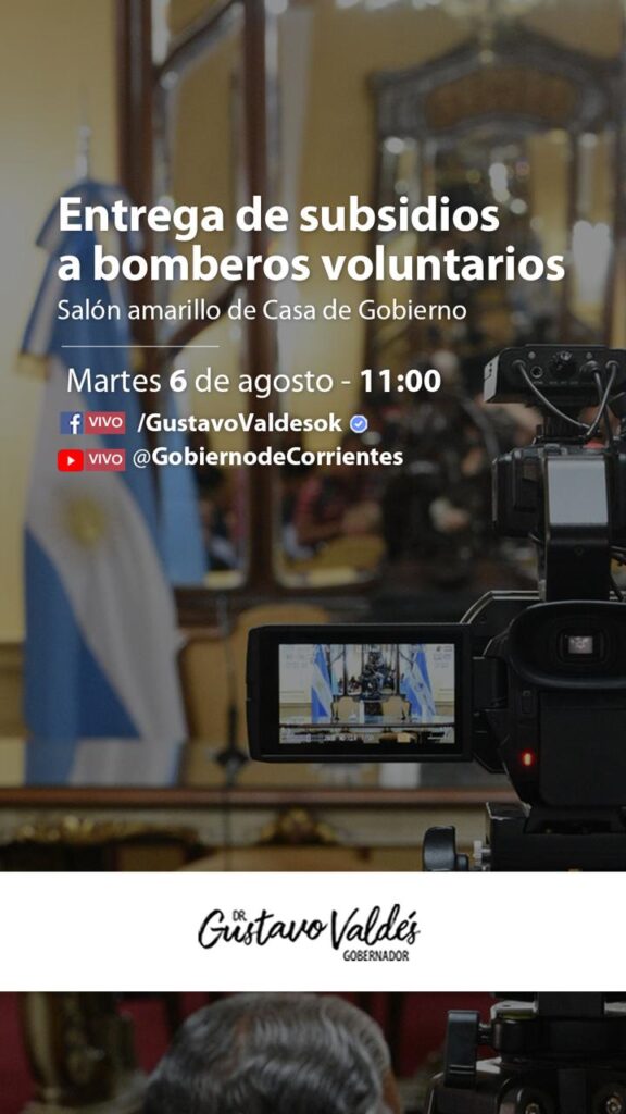 El gobernador Gustavo Valdés entregará subsidios para las Asociaciones de Bomberos Voluntarios de la provincia, este martes a las 11 horas, en el Salón Amarillo de la Casa de Gobierno.