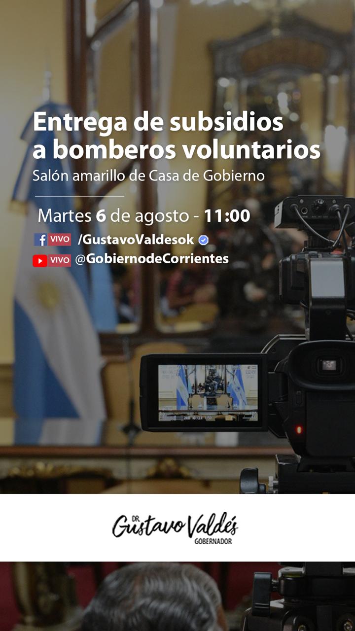 El gobernador Gustavo Valdés entregará subsidios para las Asociaciones de Bomberos Voluntarios de la provincia, este martes a las 11 horas, en el Salón Amarillo de la Casa de Gobierno.