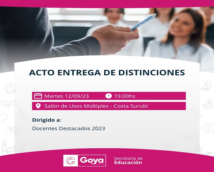 La Secretaría de Educación de la Municipalidad de Goya se prepara para llevar a cabo el acto de reconocimiento a la labor incansable de los educadores locales. El “Acto de Entrega de Distinciones a Docentes Destacados 2023” se realizará el próximo martes 12 de septiembre a las 19 horas en el salón de usos múltiples ubicado en Costa Surubí.
