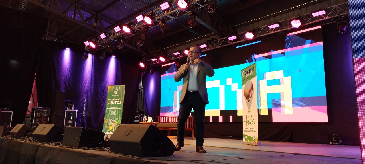 Los niños disfrutaron de la presentación de Clap Producciones recreando las historias de los personajes animados de Disney, continuando con un espacio para descubrir los riesgos para la infancia en la era digital organizado por el Programa + Vida y la Dirección de Prevención de la Municipalidad, con la disertación del Dr. Gustavo Gomez, con un cierre de la primera parte a cargo de la Banda de Carlitos.